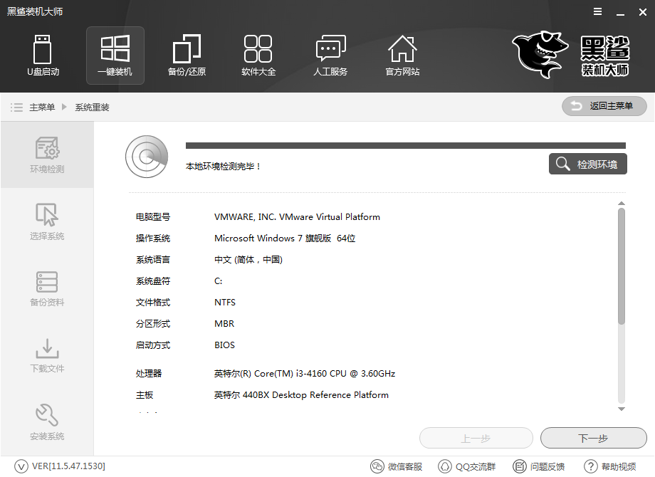 1、打开下载的安装大师,点击软件界面的“系统重装”功能,进入环境检测步骤。环境测试通过后,会显示当前电脑配置。我们可以通过配置来选择适合电脑的系统。