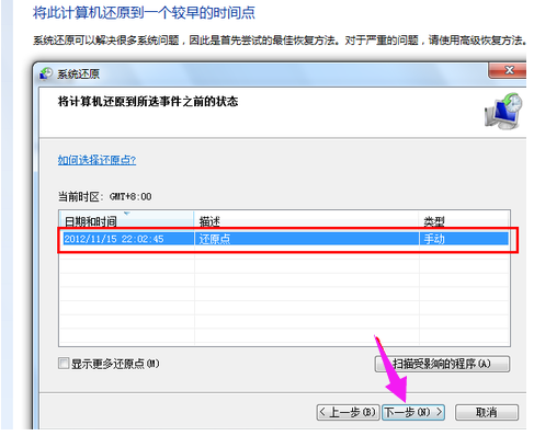 6. 在系统还原点选项中,选择一个还原点。确保选择的还原点是系统正常时的还原点。