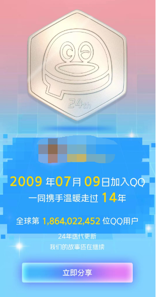 4.最后我们可以看到QQ注册时间以及我们的注册排名如图所示。单击“立即共享”将其发送给您的朋友。