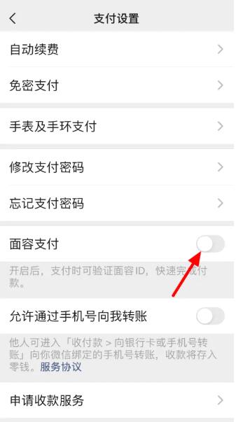 4、然后我们在支付设置中点击刷脸支付右侧的按钮即可启用该功能服务。