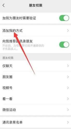 2、然后点击隐私中的好友权限,然后点击添加我的方式,如图。