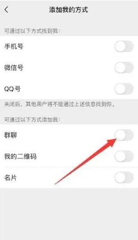 3、最后点击群聊右侧的切换按钮,关闭群聊加我,并在微信上设置,防止别人加你进群。