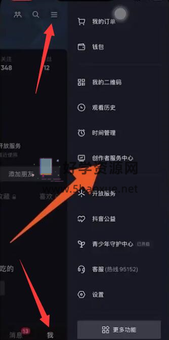1、首先打开抖音,点击右下角的我,然后点击右上角的三个横图标,点击创作者服务中心。