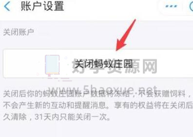 5、最后我们在账户设置界面点击关闭蚂蚁庄园,成功关闭支付宝蚂蚁庄园。