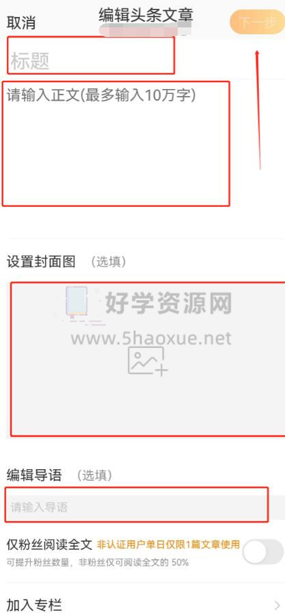 5. 输入标题和文字,设置封面和简介,然后单击“下一步”。