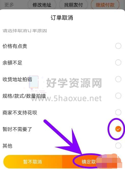 4、最后选择取消订单的原因,点击确定取消,即可在淘宝成功取消订单。