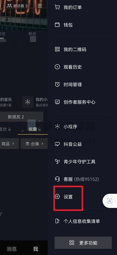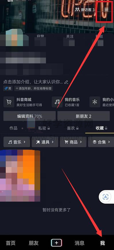 1、首先打开抖音,点击右下角的我,然后点击右上角的三个横排图标。