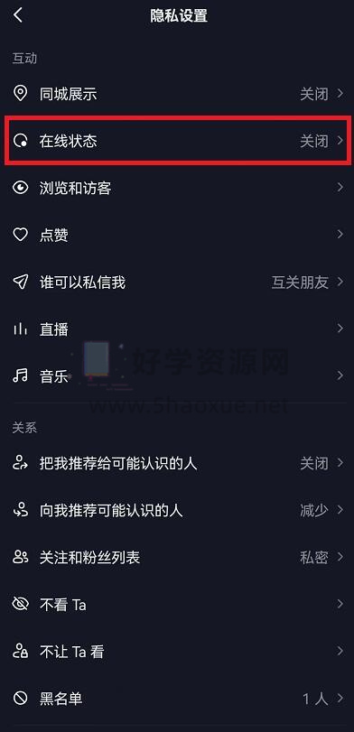 5、最后点击关闭在线状态显示,将抖音设置为不可见。