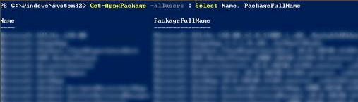 3. 在打开的命令行窗口中输入:Get-AppxPackage -allusers | Get-AppxPackage -allusers | Get-AppxPackage -allusers | Get-AppxPackage -allusers选择Name,PackageFullName命令获取当前系统安装的所有应用程序;