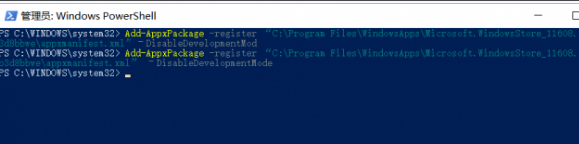 5、输入以下命令重新安装应用商店:Add-appxpackage-register'C:\ProgramFiles\WindowsApps\Microsoft.WindowsStore_11602.1.26.0_x64__8wekyb3d8bbwe\appxmanifest.xml'disabledevelopmentmode
