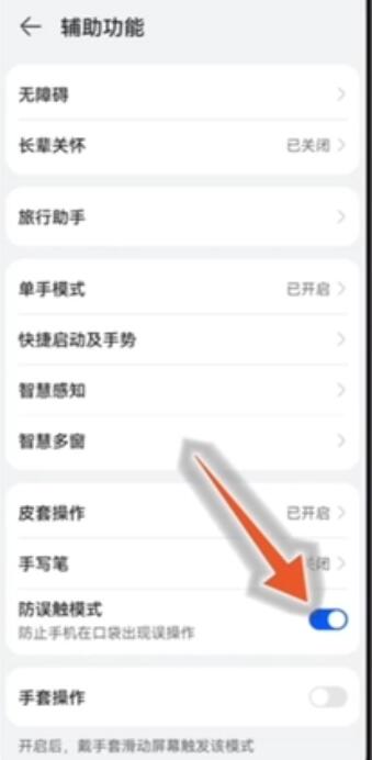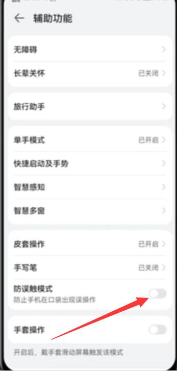 第二步:选择辅助页面【防误触模式】后面的按钮,点击并滑动;