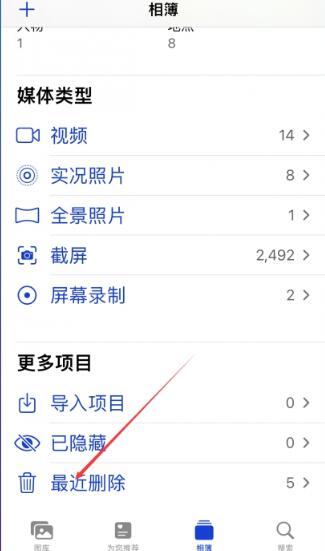 1.第一步:打开手机相册,选择【最近删除】选项;