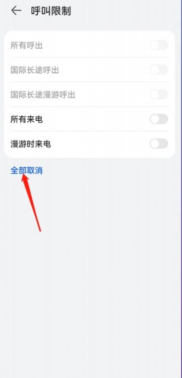 步骤5:在呼叫限制页面,选择【全部取消】,如下图所示即可完成。