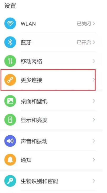 第一步:打开手机【设置】功能,选择【更多连接】进入;
