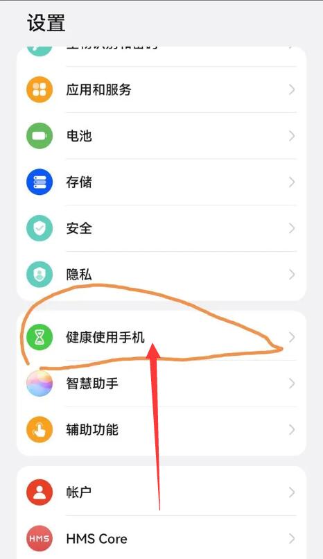第二步:进入设置页面,选择【健康使用手机】并点击;