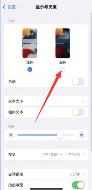 3、第三步:在显示和亮度界面,点击【暗】图标;