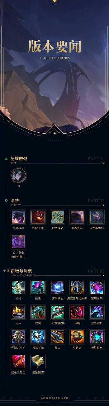 英雄联盟14.1新赛季有哪些更新内容?英雄联盟第14赛季今日更新,玩家也可以在游戏中体验全新精彩的玩法。很多玩家都不太清楚当前游戏更新了哪些内容。小编这就为大家介绍最新一季的更新内容。