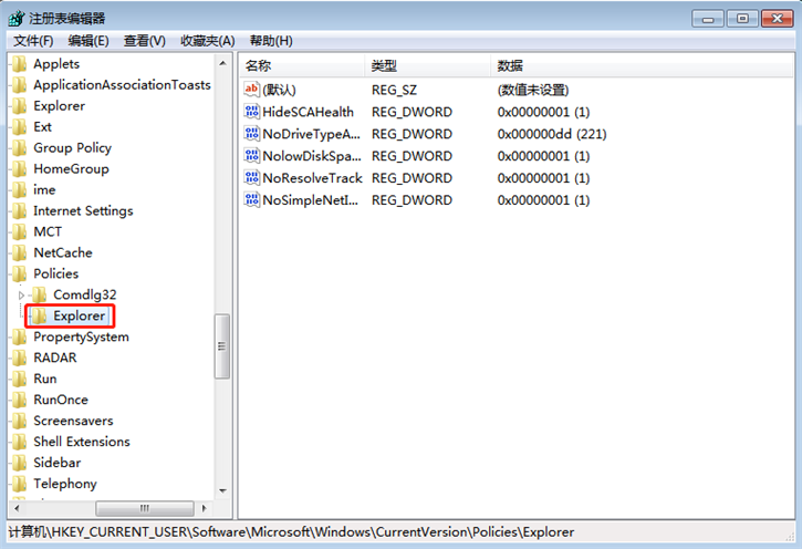 2、点击左侧菜单栏“HKEY_CURRENT_USER-Software-Microsoft-Windows-CurrentVersion-Policies-Explorer”;