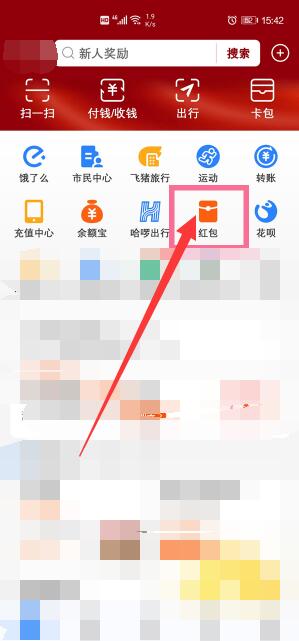 1、首先点击支付宝APP图标,进入主页面,点击【红包】选项;