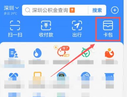1.首先进入支付宝APP,找到顶部的【卡包】按钮并点击;