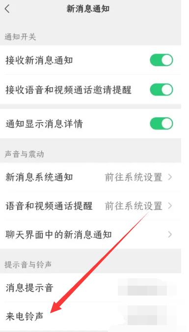 4.滑动至新消息通知界面底部,选择【来电铃声】功能并点击;