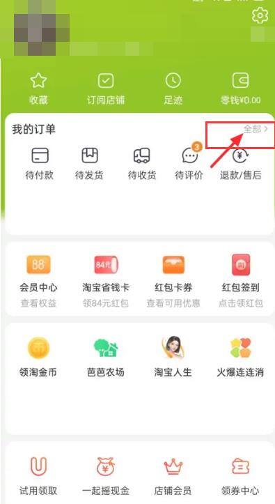1、首先点击淘宝APP进入主页面,点击底部【我的】区域,点击【全部】功能如下图箭头所示;