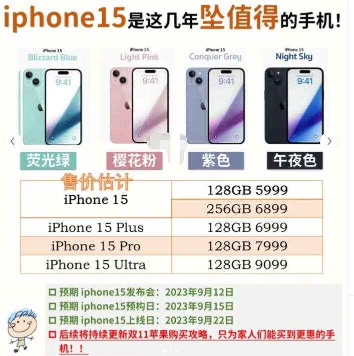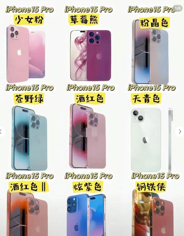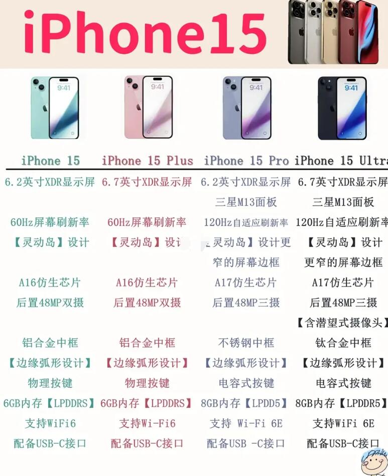 1、iPhone 15机身颜色增加了很多亮丽的颜色:粉色、芭比粉、紫色、银绿色等;