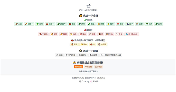 隔离食用手册网页入口是一个模拟菜谱组合选择的网页。这个网页的网址是什么?输入[https://cook.yunyoujun.cn/?continueFlag=4892de72dccce80188d1048025a8a114]跳转。这个隔离食用手册网页入口链接介绍可以告诉你具体的网页内容。下面是详细的介绍,快来看看吧。