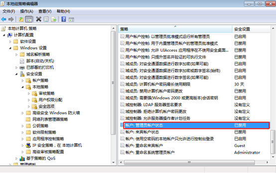 3、按照上一步点击“安全选项”后,在右侧找到“帐户:管理员帐户状态”。此时,您可以发现该账户处于“已禁用”状态。