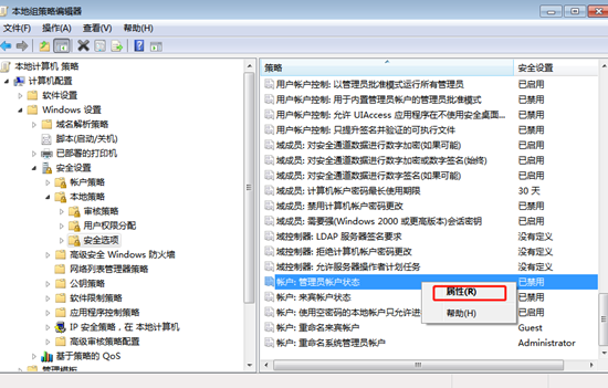 4. 右键单击并选择“帐户:管理员帐户状态”,然后在出现的菜单中选择“属性”。