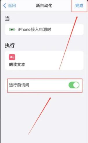 第八步:进入如下图页面,点击【运行前询问】后面的按钮,滑动,点击右上角【完成】。