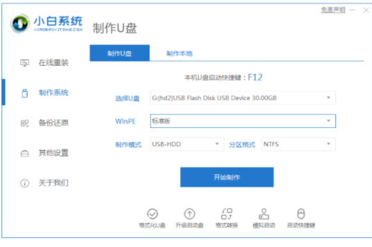 2、我们将U盘插入电脑,然后准备制作USB启动盘。点击开始制作。