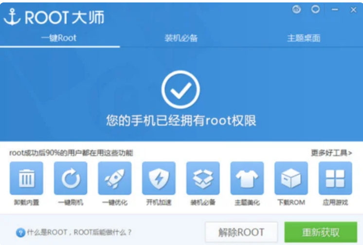 4. 手机连接成功后,会显示“您的手机已具有root权限”。此时,点击【Unroot】开始取消root。如果您不想删除root权限,但由于之前的root权限已损坏,需要修复root权限,只需点击重新获取即可。