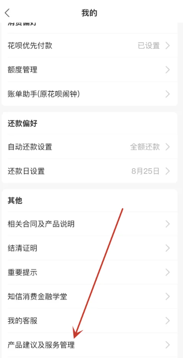 第四步:切换到花呗设备界面,滑动找到【产品建议和服务管理】选项;