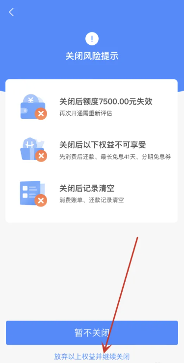 第六步:然后进入【关闭风险警告】页面,点击【放弃上述权限并继续关闭】,如下图箭头所示;