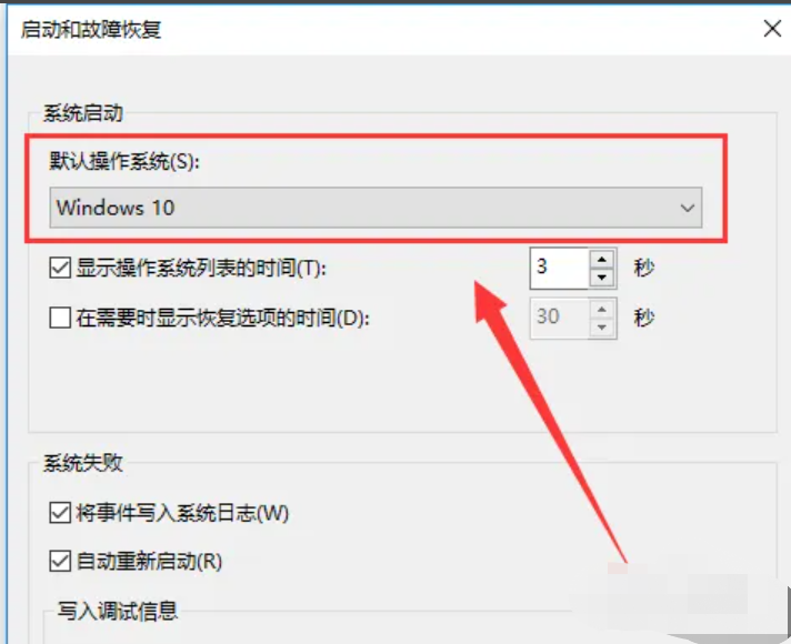 5、然后在启动和恢复页面,点击第一个【默认操作系统】并选择。