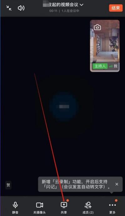 第一步:在钉钉视频会议页面,点击屏幕位置,显示工具栏,点击【分享】;