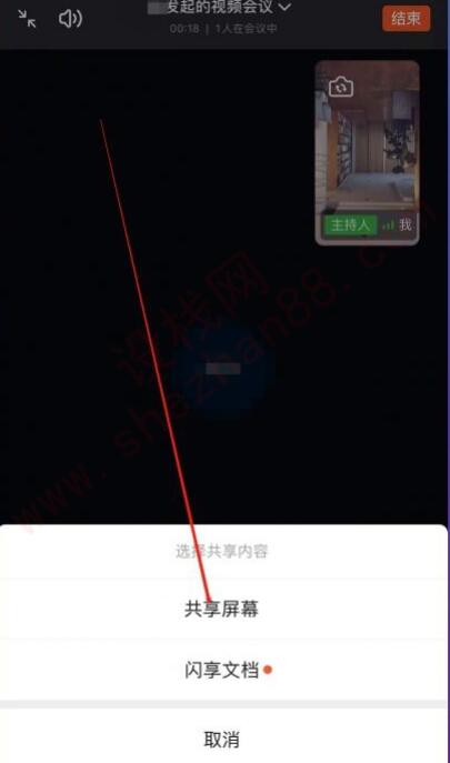 第二步:点击共享后,展开菜单栏,选择【共享屏幕】;