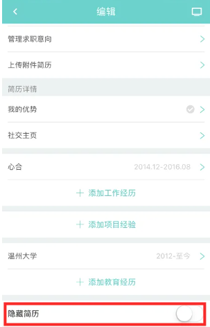 2.然后进入编辑界面,滑动底部【隐藏简历】后面的按钮;