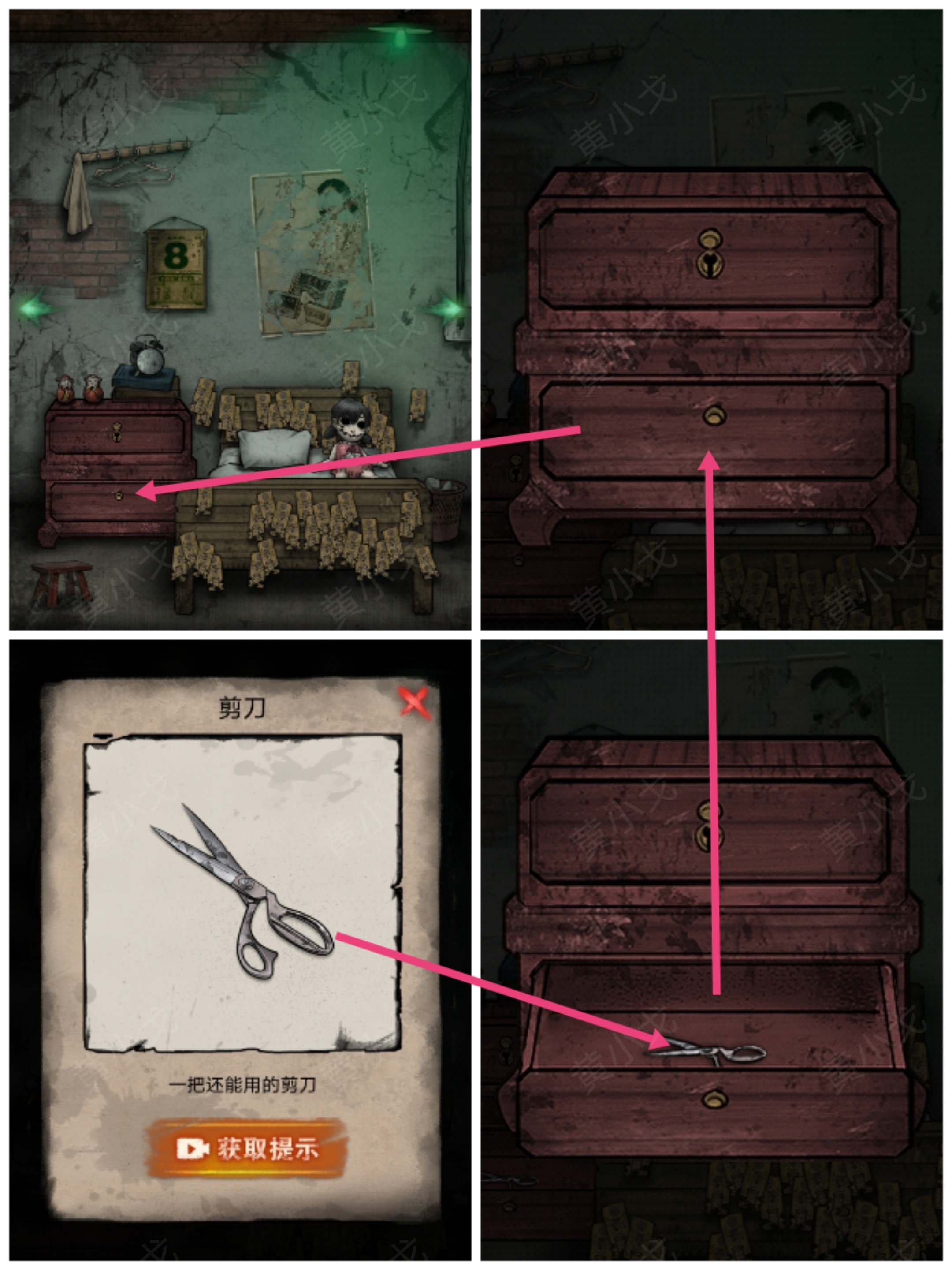9.(床)点击柜子上层抽屉,用【血红钥匙】打开,获得【证书碎片3】