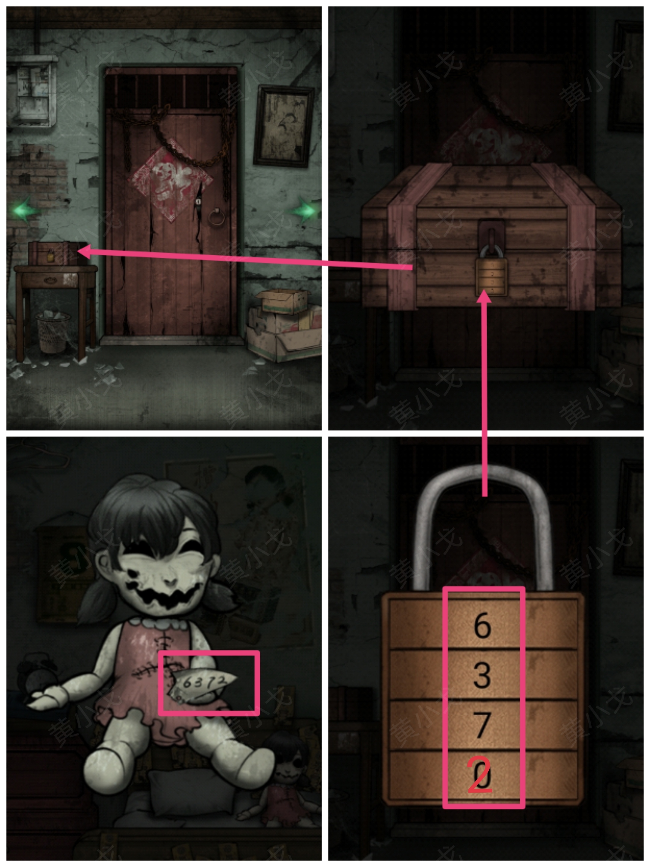 13.(门)点击桌子上的方框,根据娃娃上的线索输入密码:6372