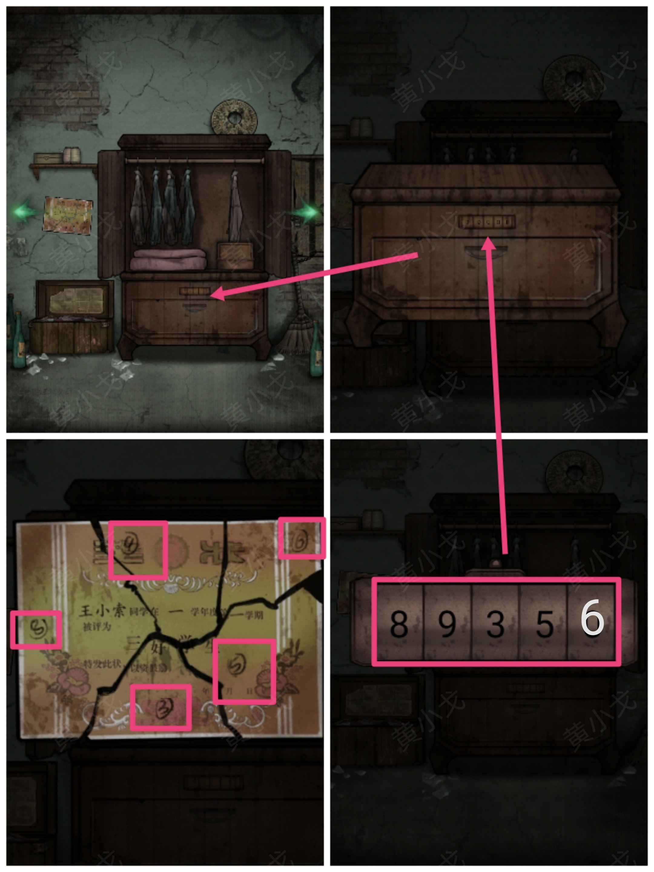 22、点击衣柜抽屉上的密码锁,根据拼装凭证上的线索输入密码:89356