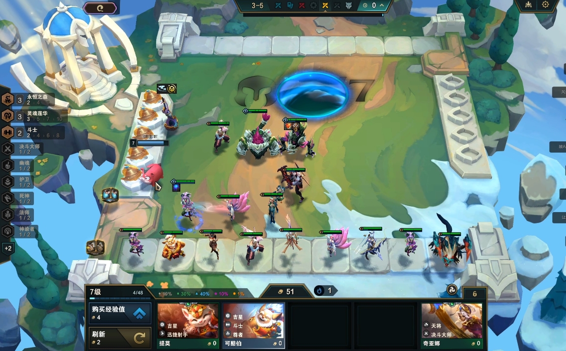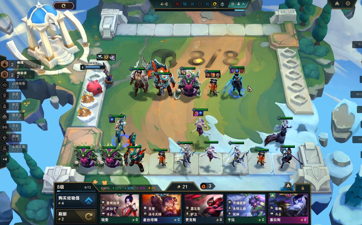 4-2拉8,大D找安妮、莉莉娅、泰坦、奥恩等四费2星1彗星组成8人基本阵容,然后存钱卡利率30 -50 慢慢D3 星四成本