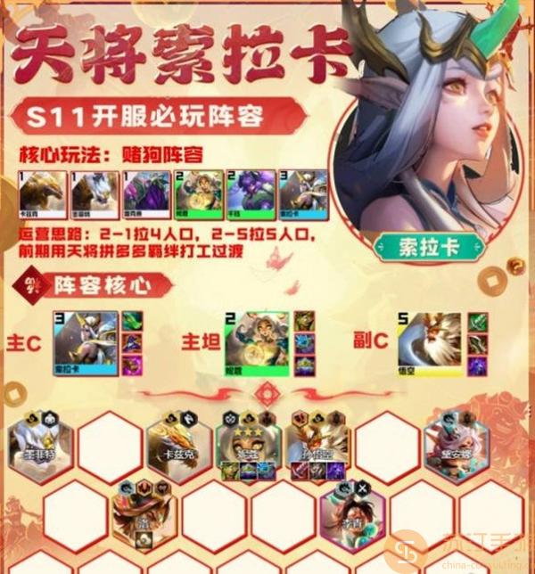 走位要点:螳螂放在第二排,尽量靠近对面的脆皮,最好和敌方主C同侧,保证能以最快的速度切入敌方后排。如果你前期选择墨菲特,就利用它低成本、轻松三星级的特点。如果后期不够强就换成孙悟空。