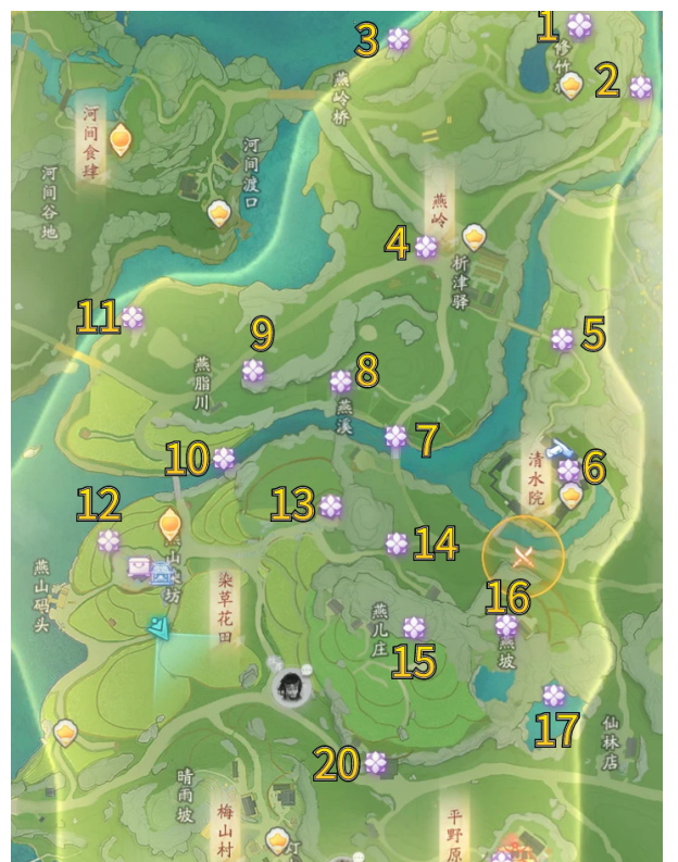 10.第九个在地图上的燕之川,在燕字右侧路灯旁边的草地里(我捡到的)。
