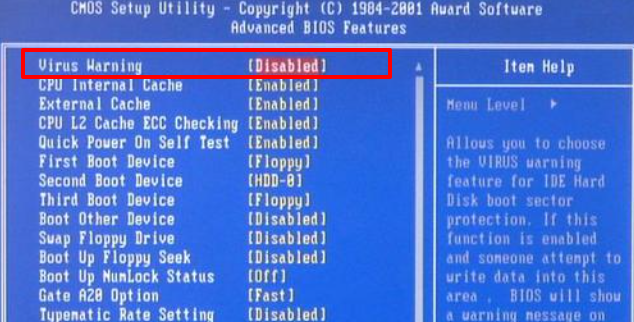 3、进入高级BIOS功能界面后,可以看到防病毒保护选项,即“病毒警告”。我们选中它并回车,将其设置为“disabled”将其关闭,最后按F10保存。