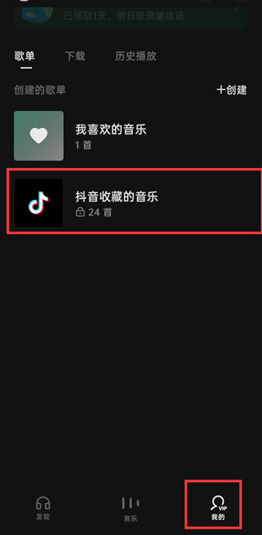2、最后登录您的账户,进入播放页面。点击右下角的【我的】部分。您可以在下图中红色边框处看到抖音收藏的音乐。
