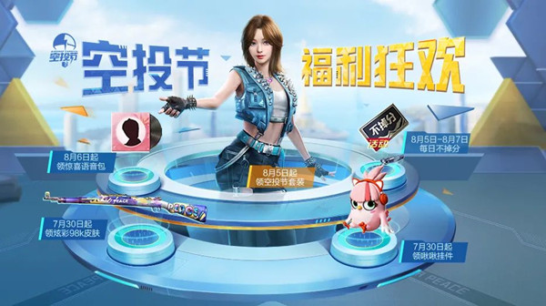 活动期间,参与空投节福利盛典活动界面内5大福利活动,即可获得空投节限定套装、全新枪皮肤和背包挂件-啾啾等奖励,海量福利轻松领取,还不快来一起参与~