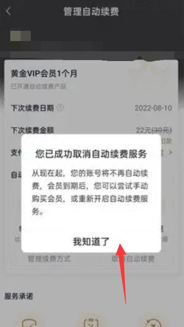 第七步:然后会提示自动续费服务已成功取消,点击【我了解】。