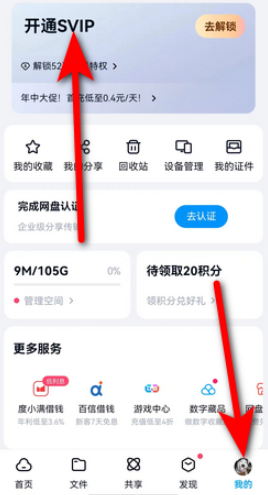 1、首先打开百度网盘APP,点击主页面下方【我的】进入专区,点击下图【开通svip】;